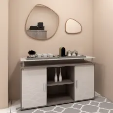 Armário misto com portas de abrir inferiores e nicho superior. Tampo confeccionado em MDP de 25 mm, corpo confeccionado em MDP de 15 mm e rodapé metálico tubular.