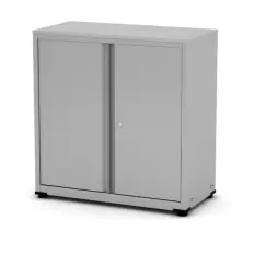 Armário baixdo com 2 portas, tampo e corpo confeccionados em MDP de 15 mm e rodapé em estrutura tubular metálica com nivelador de altura.