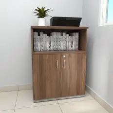 Armário charuto alto aberto com 3 prateleiras, tampo confeccionado em MDP de 25 mm, corpo confeccionado em MDP de 15 mm e rodapé em estrutura tubular metálica com nivelador de altura.
