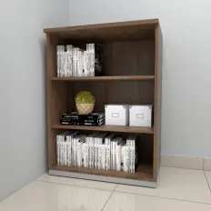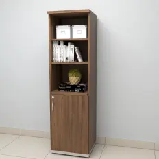 Armário torre compartilhado com passa fio, tampo confeccionado em BP de 25 mm com fita de borda de 2 mm, corpo confeccionado em BP de 15 mm com fita de borda de 1 mm, rodapé em estrutura tubular metálica com nivelador de altura, fixado com sistema Minifix e Cavilha, dobradiças 110º, fechadura com chave. Medidas: 300 x 620 x 1092 mm (largura x profundidade x altura).
