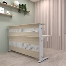 (Foto meramente ilustrativa) Balcão de atendimento em L com tampos confeccionados em MDP de 25mm revestido em melamínico BP, acabamento filetado. Pés em MDP de 25mm com calha central para passagem de fiação, painel frontal em MDP de 18mm. Pé central metálico formado por chapa de aço dobrada com calhas removíveis na parte interna. Medidas: 1400mm x 1400mm x 1100mm (largura x profundidade x altura). Verifique outras opções com nossos consultores.
