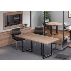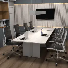 Mesa de reunião retangular bipartida com tampos confeccionados em MDP de 25 mm com caixa de tomada, pés confeccionados em MDP de 25 mm com calha para subida de fiação e saias confeccionadas em MDP de 18 mm confeccionadas.