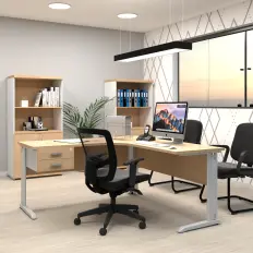Mesa de reunião retangular bipartida com tampo confeccionado em MDPde 25 mm, saia confeccionada em aço carbono e pés confeccionados em aço com calha sacavel e subida de fiação.