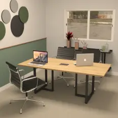 Mesa de reunião retangular com tampo confeccionado em MDP de 25 mm, saia confeccionada aço carbono e pés confeccionados em aço com calha sacavel e subida de fiação.