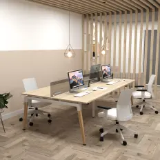 Mesa reta de trabalho com gaveteiro fixo de duas gavetas, tampo encabeçado confeccionado em MDP de 40 mm, pé painel confeccionado em MDP de 25 mm e retaguarda confeccionada em MDP de 15 mm.