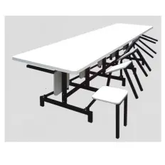 Mesa para refeitório com tampo produzido em MDF de 15 mm, encabeçado com mais 15 mm, totalizando 30 mm de espessura, revestido em fórmica, estrutura formada por tubos de aço carbono de seção retangular de 40 x 30 mm.