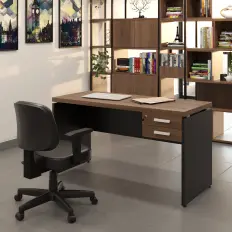 Mesa reta com tampo quadrado confeccionado em MDP de 25 mm e pés de aço tubulares com Ø63mm e base em chapa de aço de 6mm.