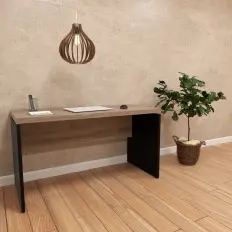 Mesa reta com tampo confeccionado em MDP de 25 mm com pé trave tubular de aço de 40 x 40 mm.