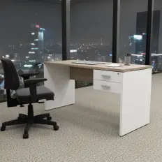 Mesa reta com tampo em MDP de 15 mm com perfil ergonsoft de 180° e pés de aço.